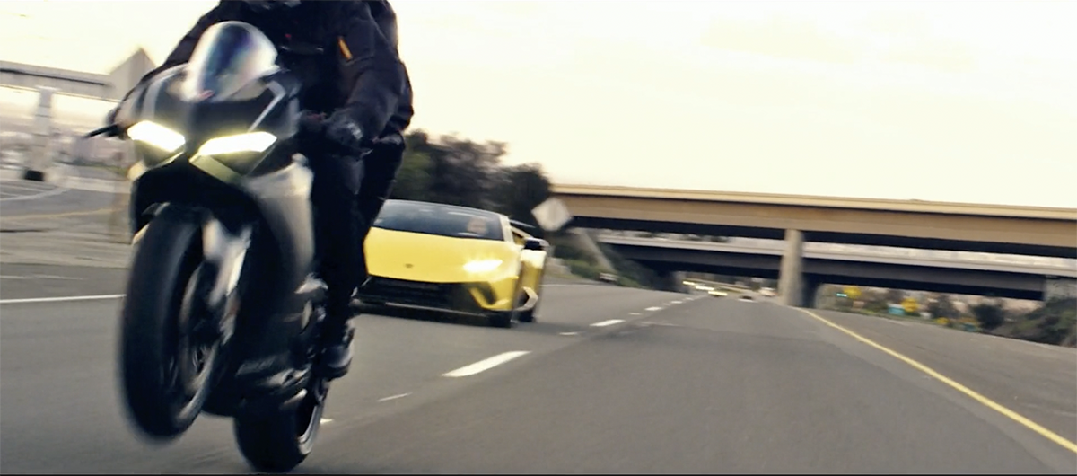 BTS STORY : Louie going thru the window is the opener The art of the mix is the dance the 650 M3 camera car used being driven by the 2nd unit director to capture the back and forth between the Ducati jewel thieves fleeing and the Lambo chasing. Other POV shots included were critical to chest protector for the bike rider to allow